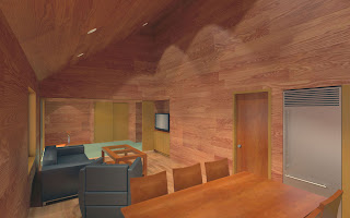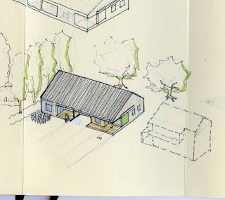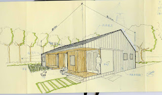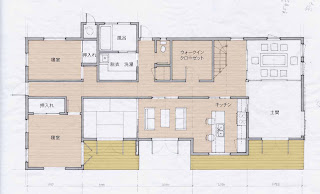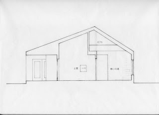キッチンはL字に変更。土間との境の壁には開口部を設ける。居間には収納、座敷には床の間を付け足した。図面の北部分は全体的に縮小し前回の見取り図よりも実用的になった。(前回は大きすぎ。) 南寝室は八畳、北寝室は約六畳。押入れは約一畳。ロフトへ上る階段は今の位置では無理があるので、居間の収納を階段にしてクローゼットを広くする、又は書斎を付け足すことも出来る。(下のスケッチ参照)