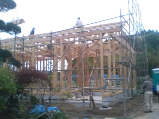 この家の特徴は最大3mの庇。庇の下はウッドデッキで縁側のような役割をし、テーブルや椅子なども置ける。庇の下の天井も同様の木材を使用し、空間としての個性を生み出す。居間の出っ張りは居間を広くするだけでなく、入り口から家の奥の座敷などへの視界を防ぎ、プライベートを確保できるようになっている。外装は杉板。ウッドデッキは暖色とし、杉板は冷色気味とすることにより家の正面を強調できる。